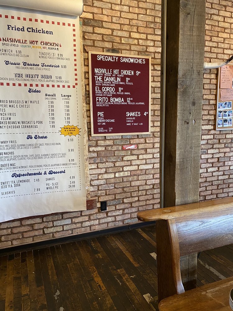 A smoked, half of a chicken, finished in the fryer, topped with our signature Alabama-style white sauce. Served with your choice of side, pickled veggies and bread.